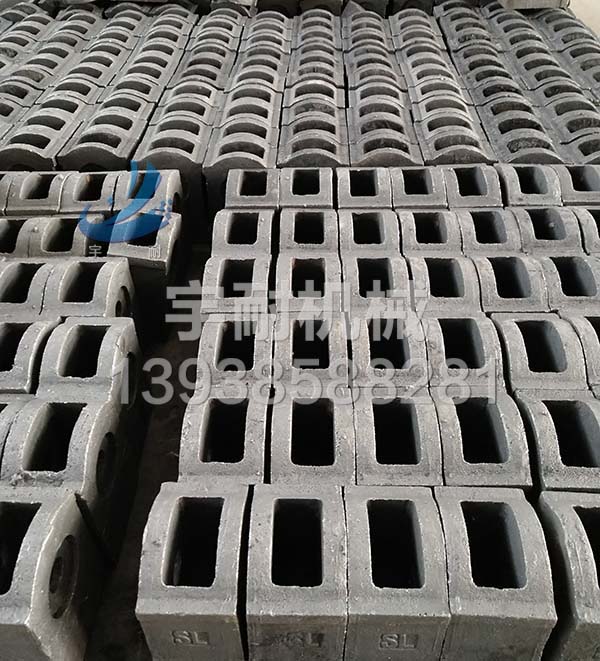 可逆錘式破碎機是冶金、建材、化工和水電等工業部門中細碎石灰石、煤或其他中等硬度以下脆性物料的主要設備之一,大特點就在于轉子可正反轉,提高了錘頭的利用率,并且對水分較大的物料也能夠破碎,是集錘破和反擊破優勢于一體,具有破碎比大,生產能力高,產品粒度均勻等特點。由于其不同于普通破碎機的設計理念,結構上采用了大轉子、短銷軸、可逆式旋轉組合的錘頭,這樣使錘頭具有打擊力度大,操作維修方便,運行成本低等優點。我公司生產的雙合金耐磨錘頭頭部采用高鉻合金材料,錘柄采用韌性較好的低合金鋼材料,利用熱復合將兩種不同性能和功效的材料在液液狀態下使其熔融為一體,復合面積可達100%,解決了鑲合金和兩次復合澆鑄錘頭容易出現的斷裂、掉塊、掉頭等現象,提高了錘頭使用的安全性。